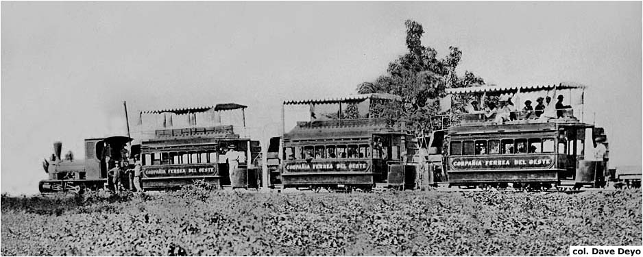 The island of Puerto Rico was one of four territories surrendered by Spain after the Spanish-American War of 1898. Cuba gained its independence, but Puerto Rico, Guam and the Philippines became possessions of the United States. The U.S. renamed the island Porto Rico – even though the word porto does not exist in Spanish! The correct spelling was officially restored in 1932. Puerto Rico's first railways were built under Spanish rule and generally used European equipment and track gauges. Its main line, the 300 mi/475 km Ferrocarriles de Puerto Rico, which opened in 1891 and circled the island, was built to meter gauge, which was unknown in North America and rare in the Caribbean. The new owners renamed it American Railroad and marked the locomotives "A.R.R." The first railway in the San Juan area was the 7 mi/12 km Tranvía (Tramway) de Ubarri. It opened in 1880, was powered by small steam locomotives, used 29.5 in/750 mm gauge and was later called Tranvía de la Capital. The line ran from Old San Juan along Av. Ponce de León to Río Piedras [see map]. The area's second railway was the 4 mi/7 km Línea Férrea del Oeste (Western Rail Line), which opened in 1883 and connected Cataño and Bayamón across the bay. It was operated by the Compañía Férrea del Oeste and used meter gauge. No suitable illustration of the Ubarri line – the Tranvía de la Capital – could be found. But here is an extremely rare, very old, never before published photograph of the Línea Férrea del Oeste. The picture was probably taken in the 1880s. The origin of the trams is unknown [col. Dave Deyo; reproduced with his permission]: |