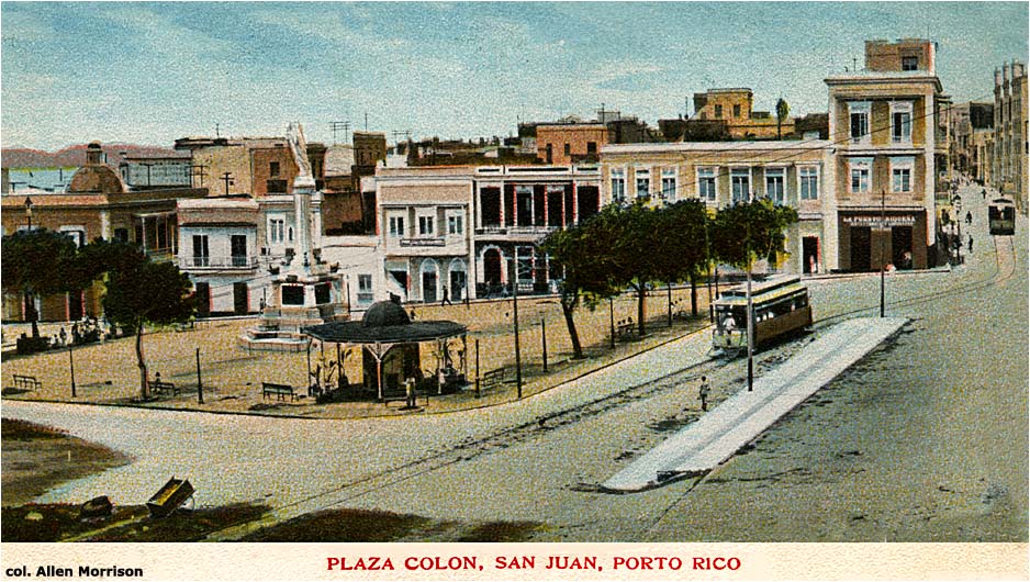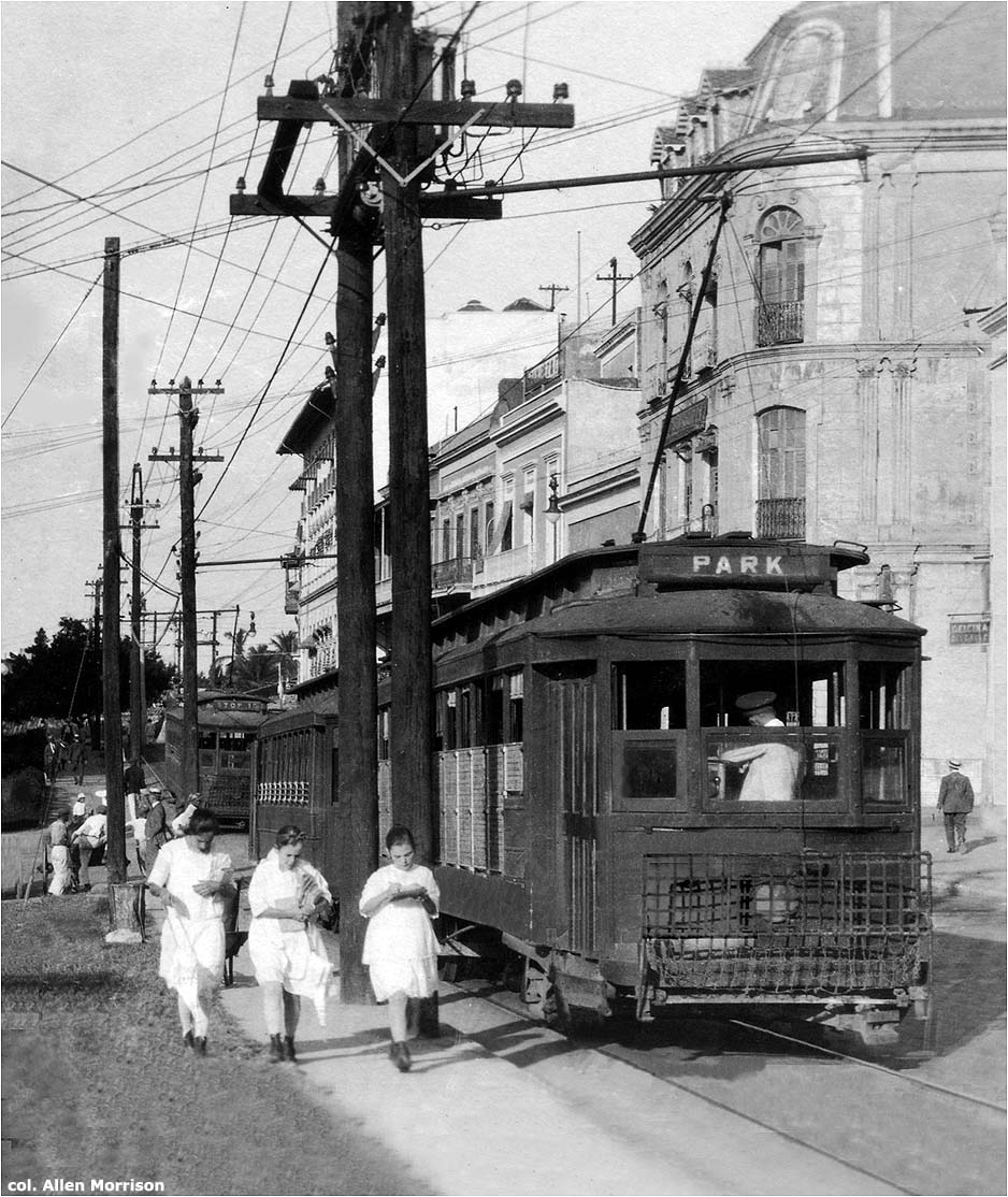 J. G. White Engineering Co. of New York laid new 70-pound standard gauge track and strung overhead wire along Av. Ponce de León, exactly duplicating the steam line, from San Juan to Río Piedras [see map]. In the historic district called Old San Juan the electric cars looped through the narrow streets. San Juan Light & Transit inaugurated its new 8 mi/13 km electric line to Río Piedras on 1 January 1901 [Street Railway Journal, 23 IX 1905, p. 446: see BIBLIOGRAPHY]. Note flags: