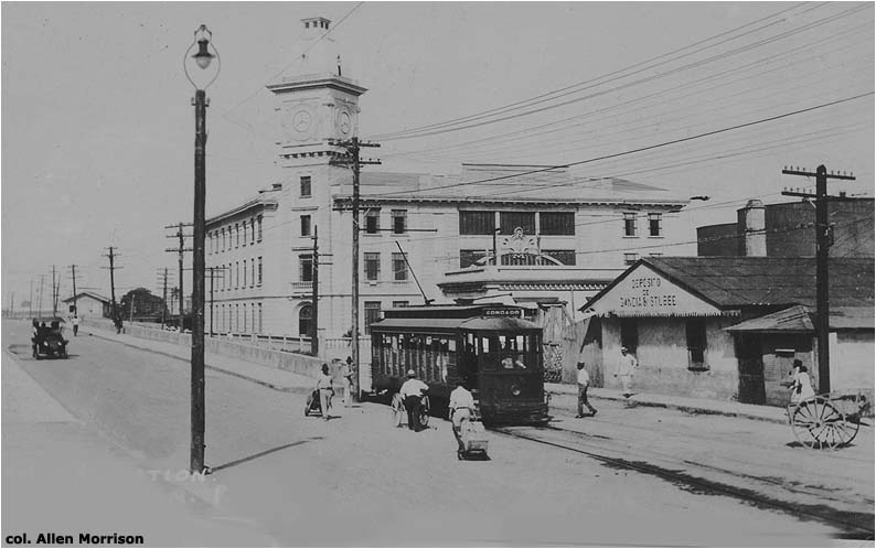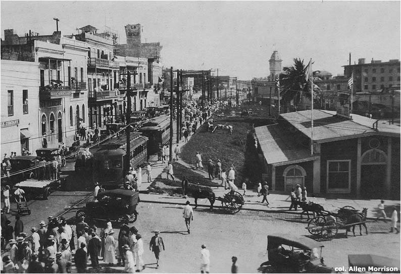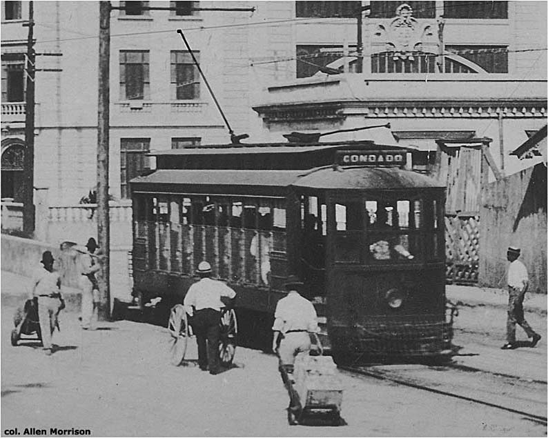 In Santurce the line was on the south side of Av. Ponce de León [see map], so this view is west. The tram has just passed another car on the siding and is going toward Old San Juan [postcard, col. AM]