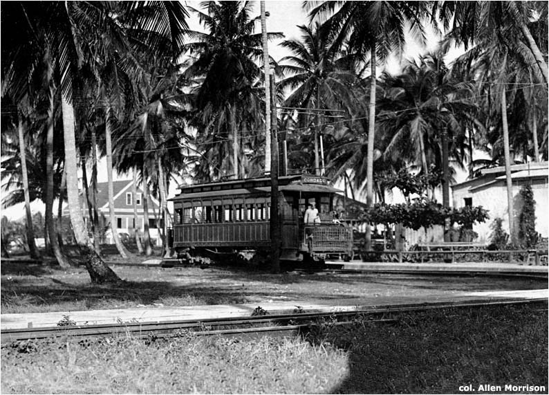 In 1911 PRRL&P built a new line through Condado which connected with the Park line and formed a large loop [see map]. Track was single, but there were sidings on each leg of the loop so that trams could go around it in both directions. This new track completed the San Juan tramway system. It never expanded further. The entire network was, and always remained, single track with sidings. Cars ran in both directions on the single track, such as that shown below on the causeway that connected San Juan with Condado (in the distance). Tram 25, signed "CONDADO", is presumably a reconstruction of one of the "Caguas Tramway" cars shown above [col. AM]: