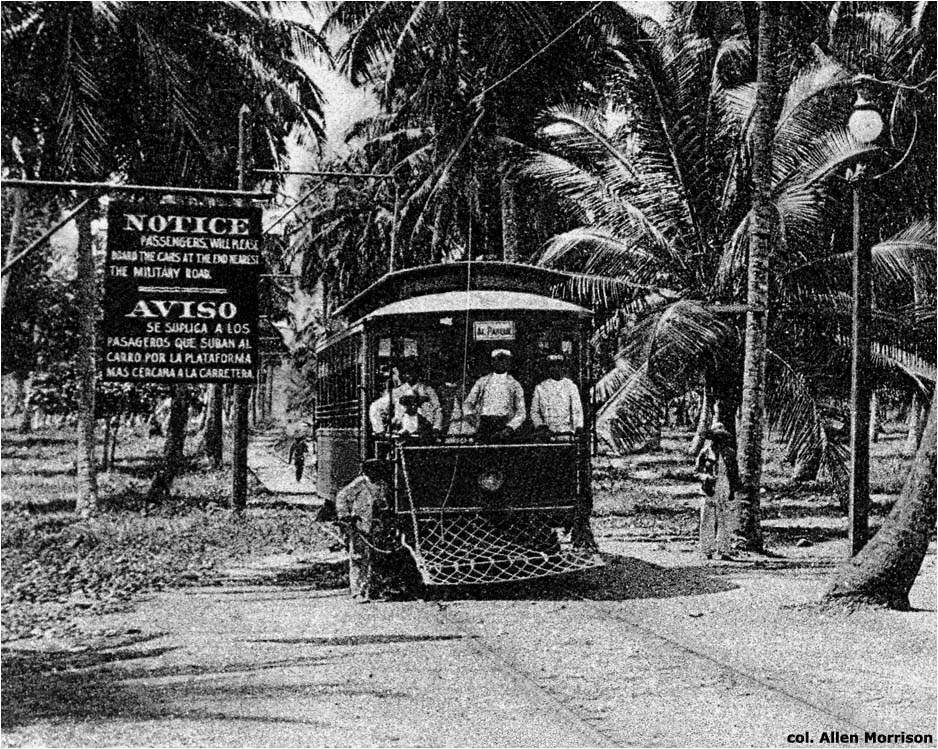 About 1903 SJL&T built a branch from stop/parada 23 north to a park that it built on the Atlantic Ocean [see map]. Trams going to Borinquen Park were signed "AL PARQUE" or "PARK". In 1906 San Juan Transit was absorbed by a new Canadian organization, Porto Rico Railways Co., which formed a subsidiary, Porto Rico Railway, Light & Power Co., to operate the tramway and other utilities. The Stephenson tram in the picture below shows its new owner [col. AM[:
