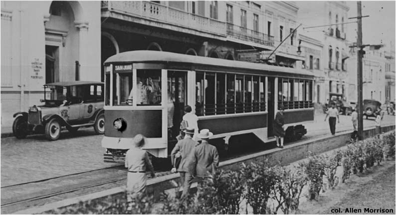 Tram 4 in this photograph, taken on Calle San José in Old San Juan [see map], is apparently from the original American Car Co. fleet of 1900 [col. Joaquín Flores]: