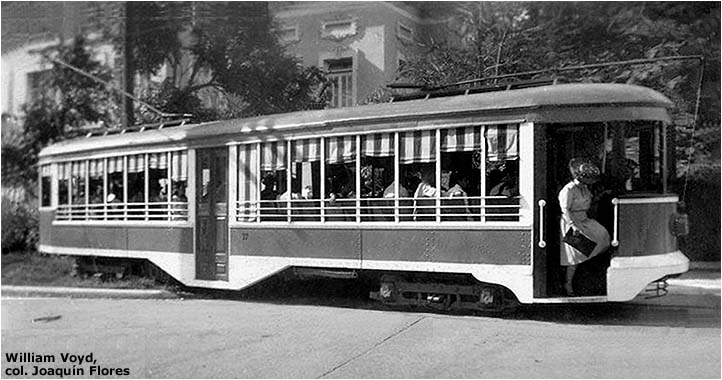 J. G. White graded the extension and began laying standard gauge track, but Caguas Tramway changed its mind and decided to build a meter-gauge steam line instead, in order to provide interchange with the meter-gauge American Railroad, which it intersected in Río Piedras [see map]. The rails were moved over. Overhead wires were never installed. The new Brill cars never ran to Caguas but were instead renumbered 18-25 and used in San Juan. PRRL&P's Río Piedras - Caguas steam railroad opened in 1908. Despite the name on the Brill cars, which has misled historians, the city of Caguas never had a tramway, nor did trams ever run between Río Piedras and Caguas. The steam railroad was never electrified and closed in 1928 [see below]. In 1910 Porto Rico RL&P placed an order with Brill for 10 quasi-open trams with screened sides and center aisles which were similar to cars that ran in summers in New York and other U.S. cities. They were numbered 26-35 and called "jaulas" (cages) by San Juan residents [Brill Magazine, V 1911, p. 141: see BIBLIOGRAPHY]: