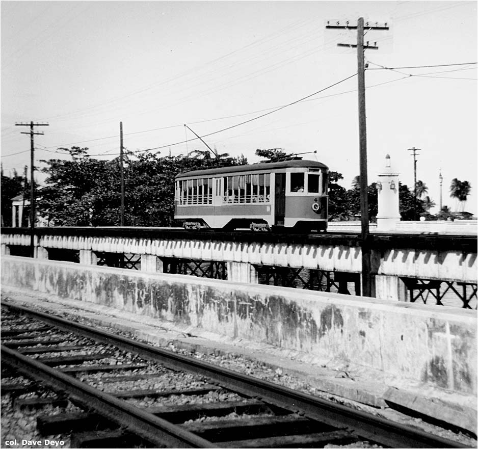 On 13 September 1928 San Juan was ravaged by Hurricane Okeechobee (called Huracán San Felipe in Puerto Rico), the only category 5 storm ever to hit the island. Because Puerto Rico had sufficient warning (thousands had perished in Guadalupe), there were relatively few fatalities in San Juan, but the Río Piedras tram line and depot were damaged beyond repair and were abandoned. The steam railway to Caguas and the Línea Férrea del Oeste, which ran from Cataño to Bayamón across the bay, also closed at that time. After September 1928 PRRL&P parked its trams in a yard at Borinquen Park and buses ran along Av. Ponce de León to Río Piedras [see map]. The new Perley Thomas cars had been spared, but many other trams were lost. The World Survey of Foreign Railways of 1933 [see BIBLIOGRAPHY] reported only 11 passenger trams in operation in San Juan – the six Perley Thomas cars and five older cars. The following two illustrations were copied from an album of photographs taken by an American professor who taught at University of Puerto Rico in 1937-1939. The Perley Thomas trams had a new paint scheme. Number 40 is crossing the trestle next to the San Antonio railroad bridge [Robert A. Hall]: